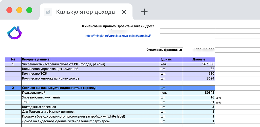 Вы — инвестор. Открытие бизнеса с командой «Онлайн Дом» в выбранном городе. Доход 50/50. Выход на прибыль — через 8 месяцев, окупаемость — за 1 год 7 месяцев.