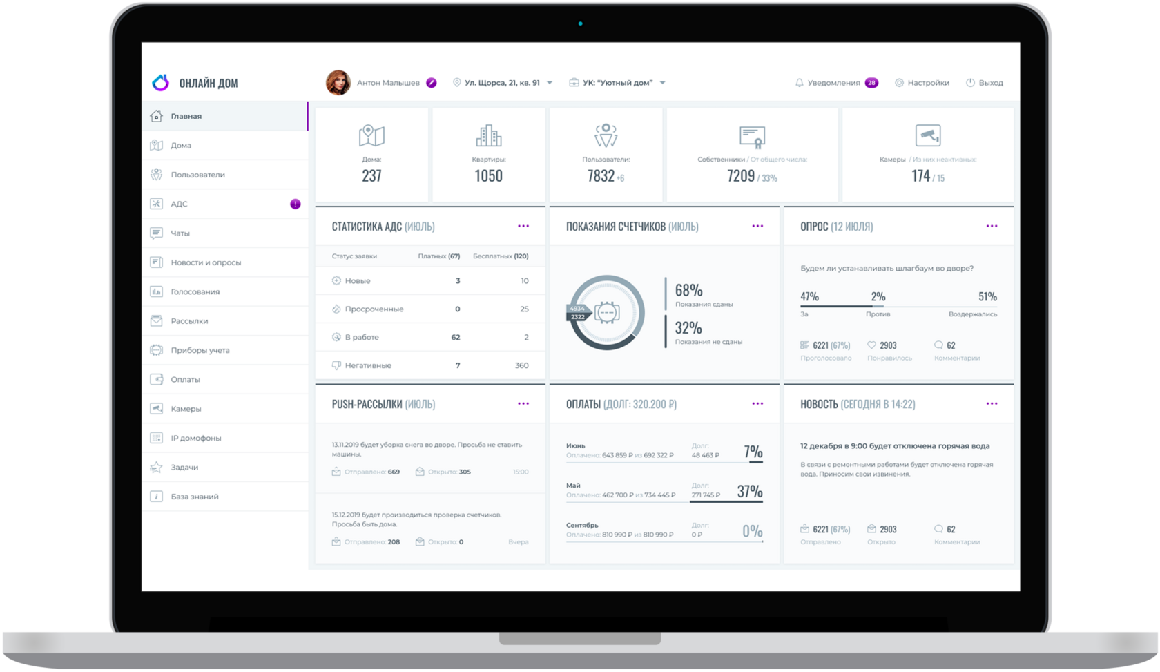 На главной странице доступна сводная статистика по основным разделам системы: адреса, количество квартир, настройки домов, количество пользователей в каждом доме, а также динамику их подключения. Информация обновляется в режиме реального времени и позволяет руководителю оперативно ориентироваться в общей картине работы всей компании.