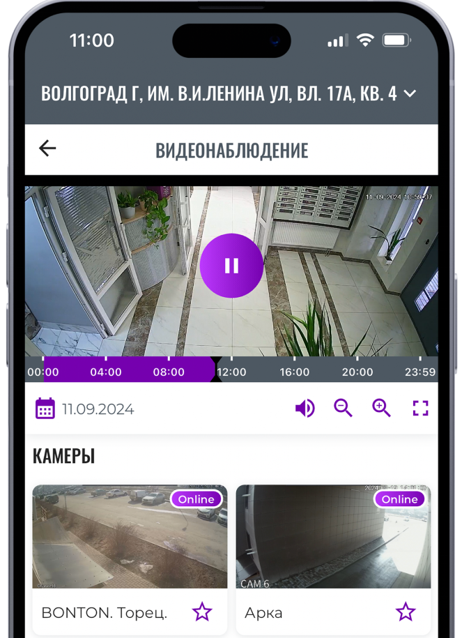 Просмотр камер видеонаблюдения прямо с мобильного приложения. Есть функция перемотки архива записи на 3 дня и функция скачивания отрезков